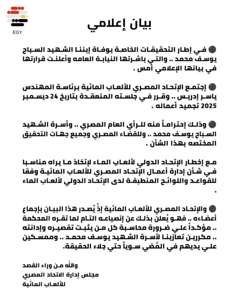في إطار التحقيقات الخاصة بوفاة إبننا الشهيد السباح يوسف محمد والتي باشرتها النيابة العامة وأعلنت قرارتها في بيانها الإعلامي أمس اجتمع الاتحاد المصري للألعاب المائية برئاسة المهندس ياسر إدريس وقرر في جلسته المنعقدة بتاريخ 24 ديسمبر 2025 تجميد أعماله، وجاء ذلك القرار احتراماً للرأي العام المصري وأسرة الشهيد السباح يوسف محمد وللقضاء المصري وجميع جهات التحقيق المختصه بهذا الشأن.